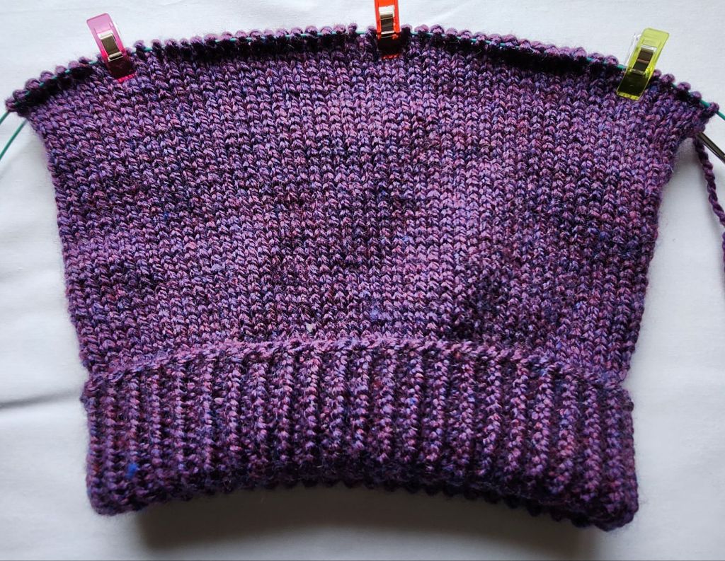 When planning that hat, I wanted a simple stocking stitch design. However, I knew the hat would need some texture to it. To achieve this, I decided to use a 1×1 rib in k1, p1 tbl for the double brim. This will make the twisted stitch more visible when the brim is turned back and effectively provide the interest needed in the design.